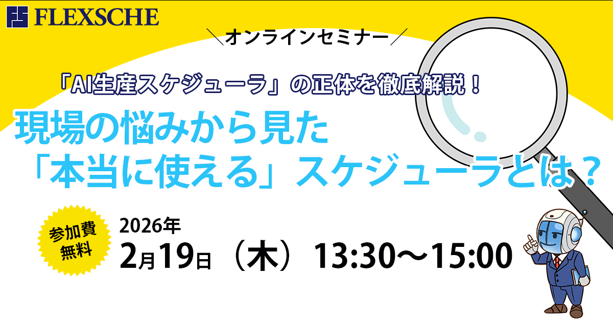 | 「AI生産スケジューラ」の正体を徹底解説!現場の悩みから見た「本当に使える」スケジューラとは? | 02月19日(木) 13:30~15:00 |