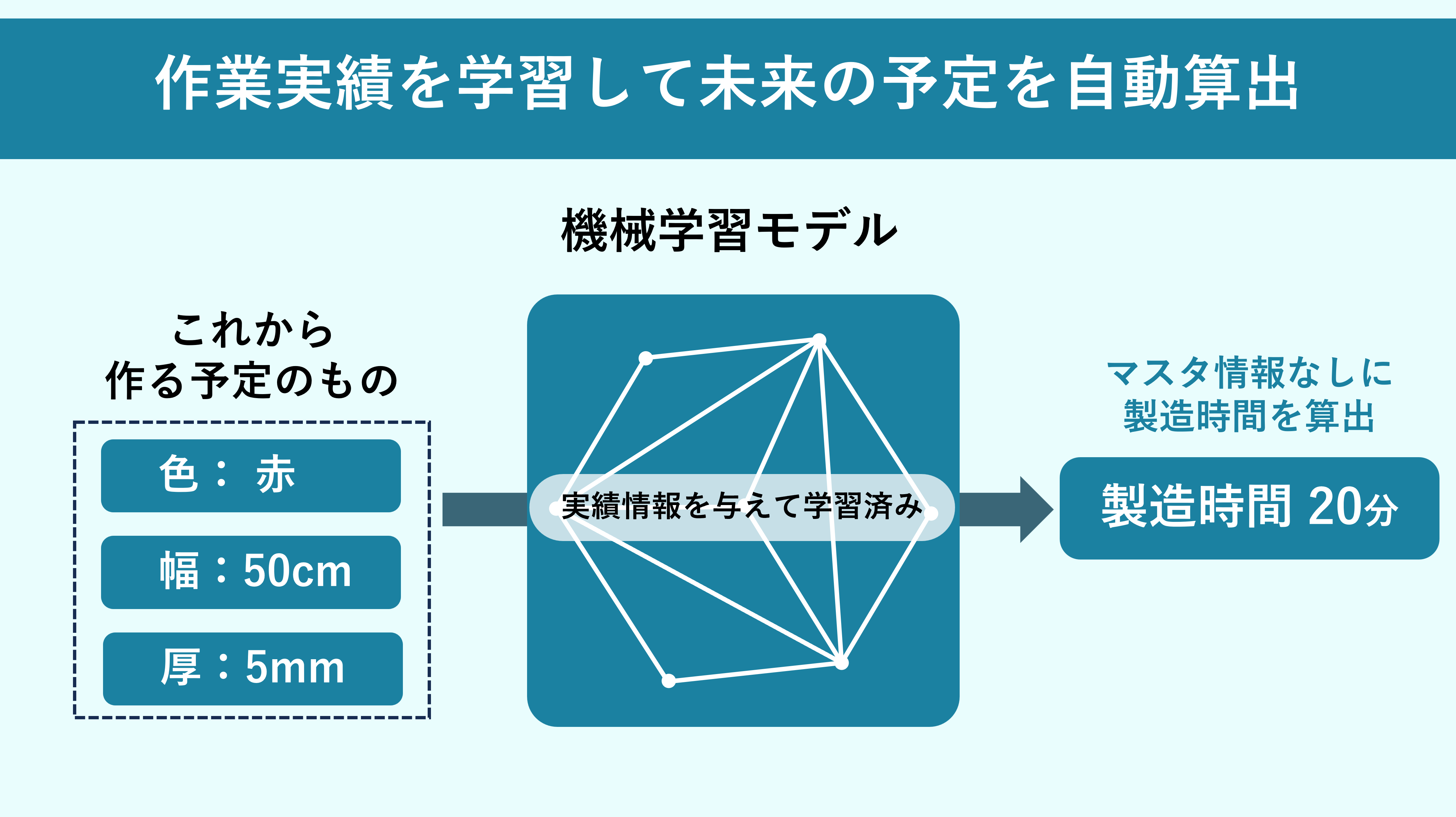 実際に作業を行った時の諸条件と掛かった作業時間を機械学習モデルに与えることで条件によって作業時間がどのように変化するかを学習します。
