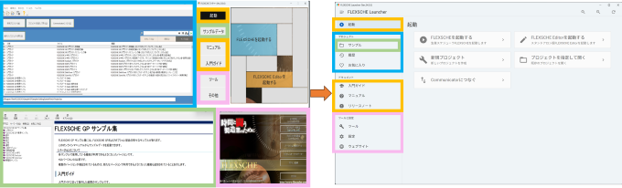 スタートアップ、旧ランチャー、GPサンプル集、設定ユーティリティを統合して使いやすくしました。 色付きの枠は対応する機能を示しています。